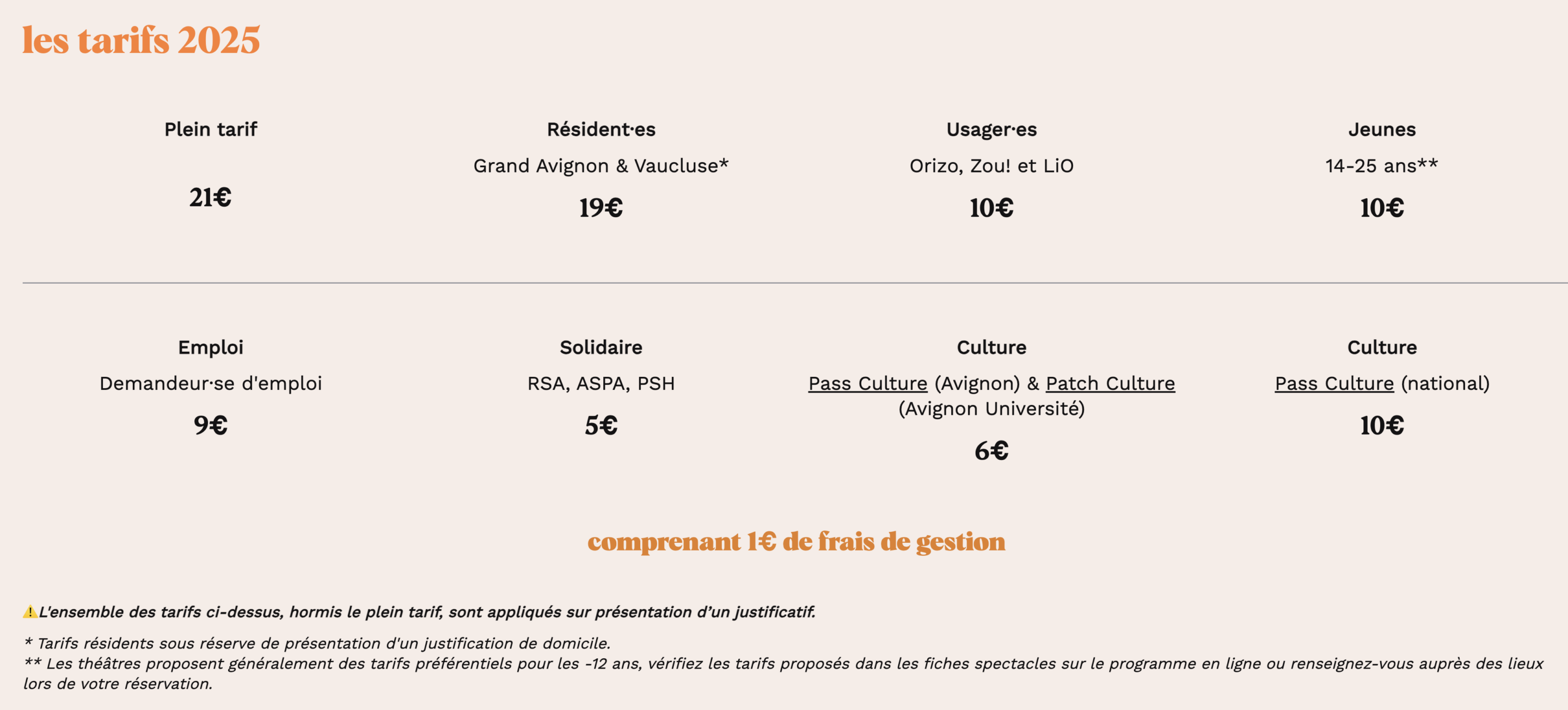 Cette carte est à acheter auprès du festival Off directement, elle vous offre 30% de réduction sur l’ensemble des spectacles du off
